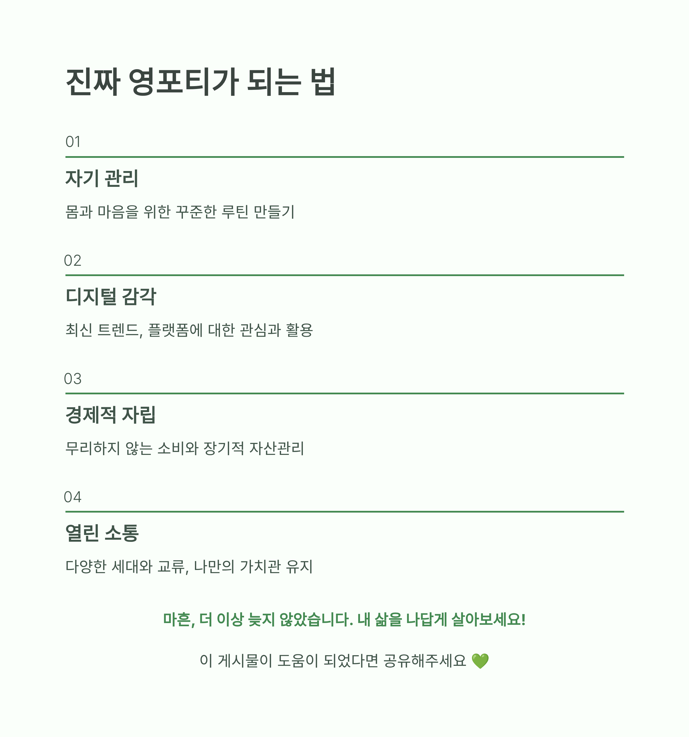 | 경제적 자립 | 무리하지 않는 소비와 장기적 자산관리 |
