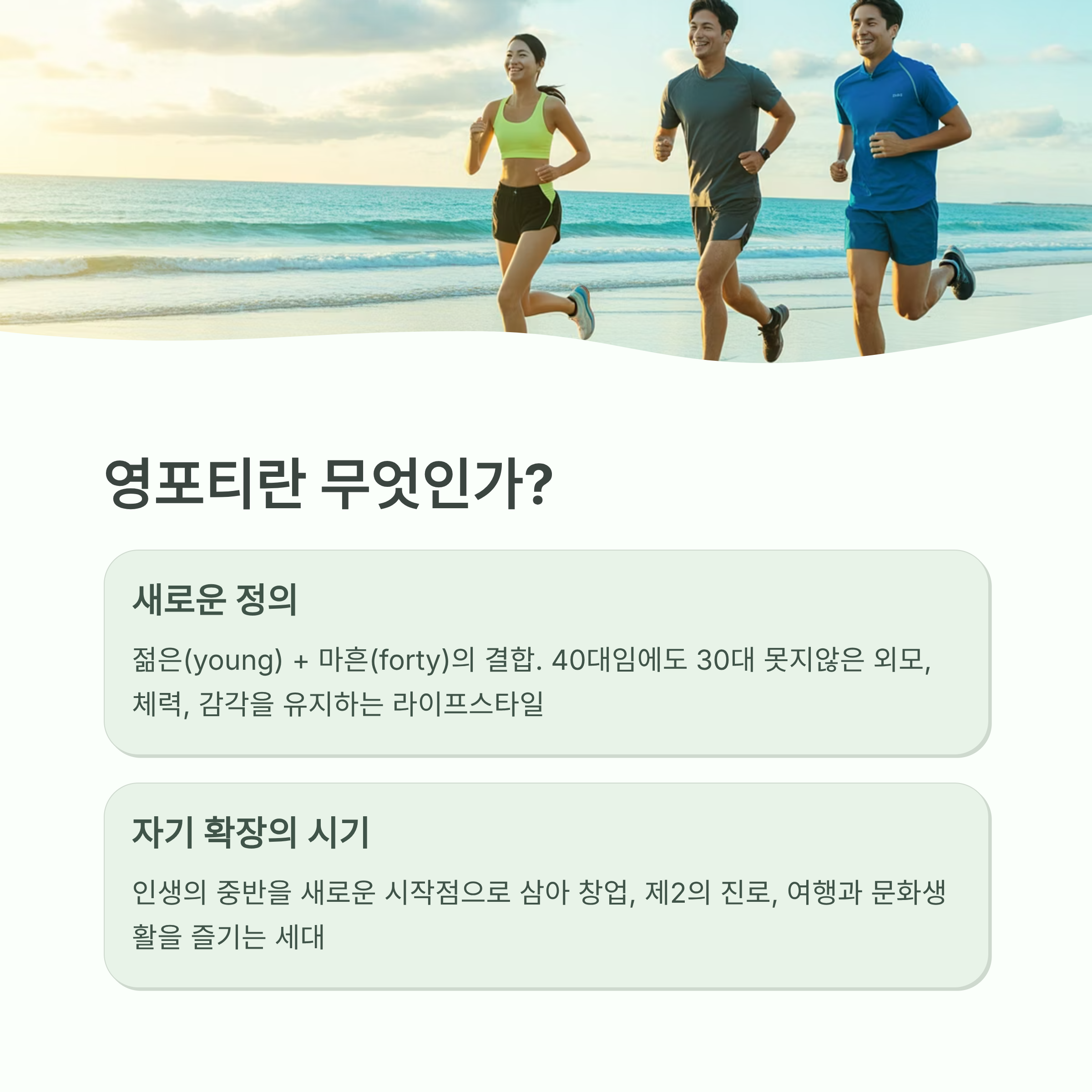 하지만 단순한 겉모습만을 의미하진 않습니다. 영포티는 인생의 중반을 새로운 시작점으로 삼는 '자기 확장의 시기'입니다. 직장생활에서 벗어나 창업을 준비하거나, 제2의 진로를 모색하고, 여행과 문화생활을 즐기는 이들이 늘고 있습니다.
