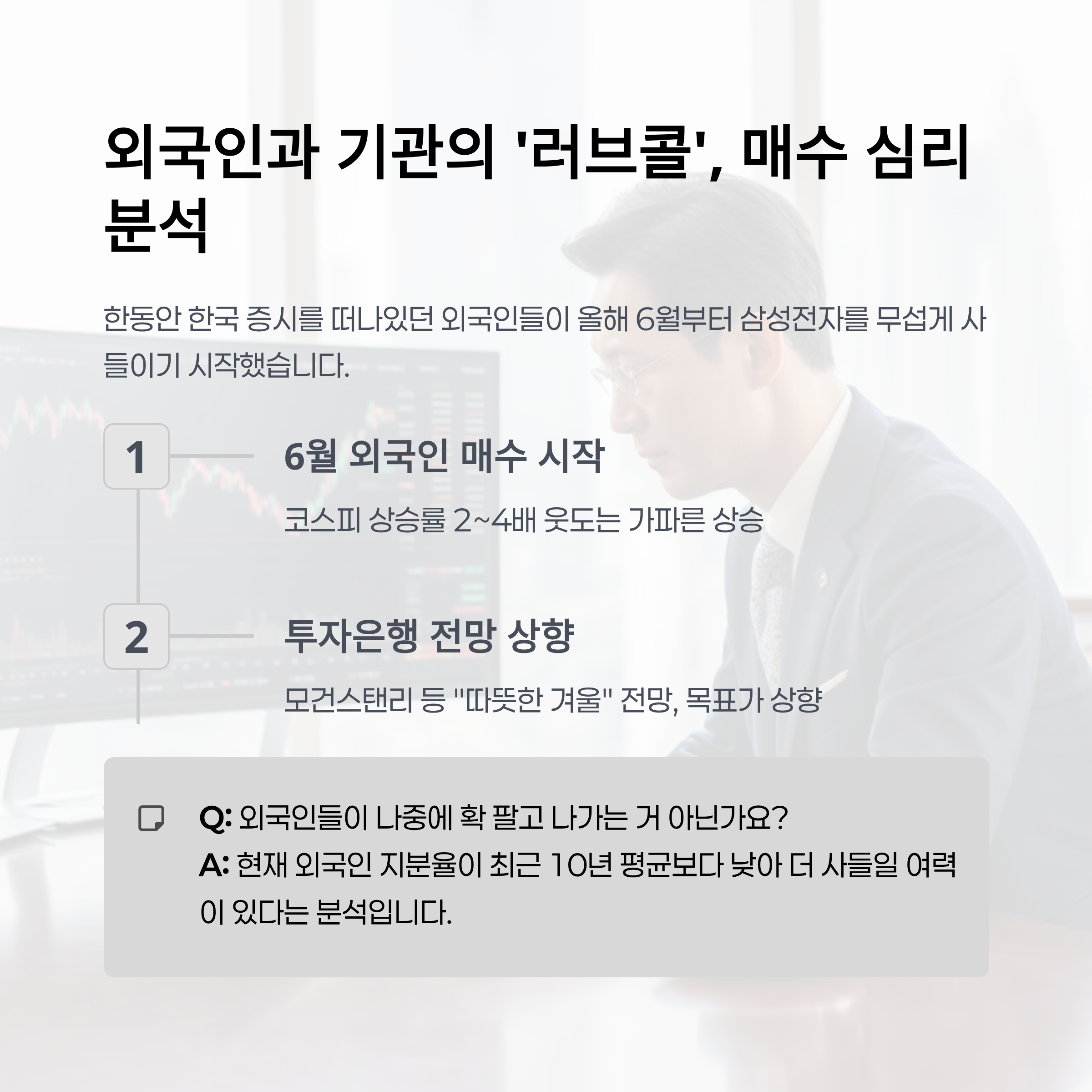 짧은 Q&A 대화체: "근데 외국인들이 이렇게 많이 사면 나중에 또 확 팔고 나가는 거 아니에요?" "걱정하실 수도 있죠. 하지만 현재 외국인 지분율이 아직 최근 10년 평균치보다는 낮은 수준이라는 분석도 있어요. 즉, 앞으로 더 사들일 여력이 있다는 거죠. 물론, 투자라는 건 항상 변수가 있지만, 지금은 전반적으로 '사자' 분위기가 지배적이라는 걸 아시면 돼요."